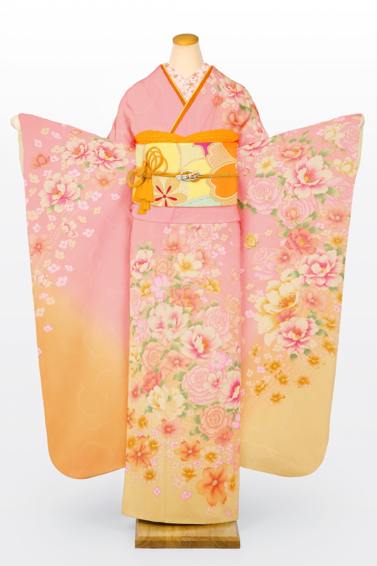 ピンクからクリーム色へと移るぼかし染めされた優しい色合いの可愛らしい振袖。カラフルに描かれた草花模様が幻想的な雰囲気で描かれています。振袖は未婚女性の第一礼装です。成人式や結婚式、披露宴などの御呼ばれや結納などのお目出たい席にぴったりの着物です。和楽庵の振袖フルセットレンタルは、振袖、袋帯、長襦袢、帯〆、帯上、重ね衿、草履、和装バックの他に着用するために必要な和装下着、衿芯、帯枕、前板、後ろ板、腰紐、伊達締め、コーリンベルト、補正パット、補正用タオルが全てついております。また、足袋はプレゼントとなっております。その他にも髪飾りレンタルなどのオプション品もございます。