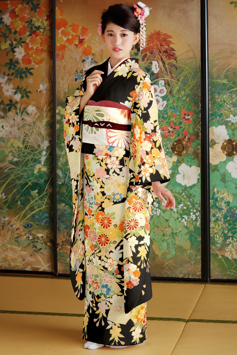 振袖レンタル LLサイズ 黒/扇面図草花文