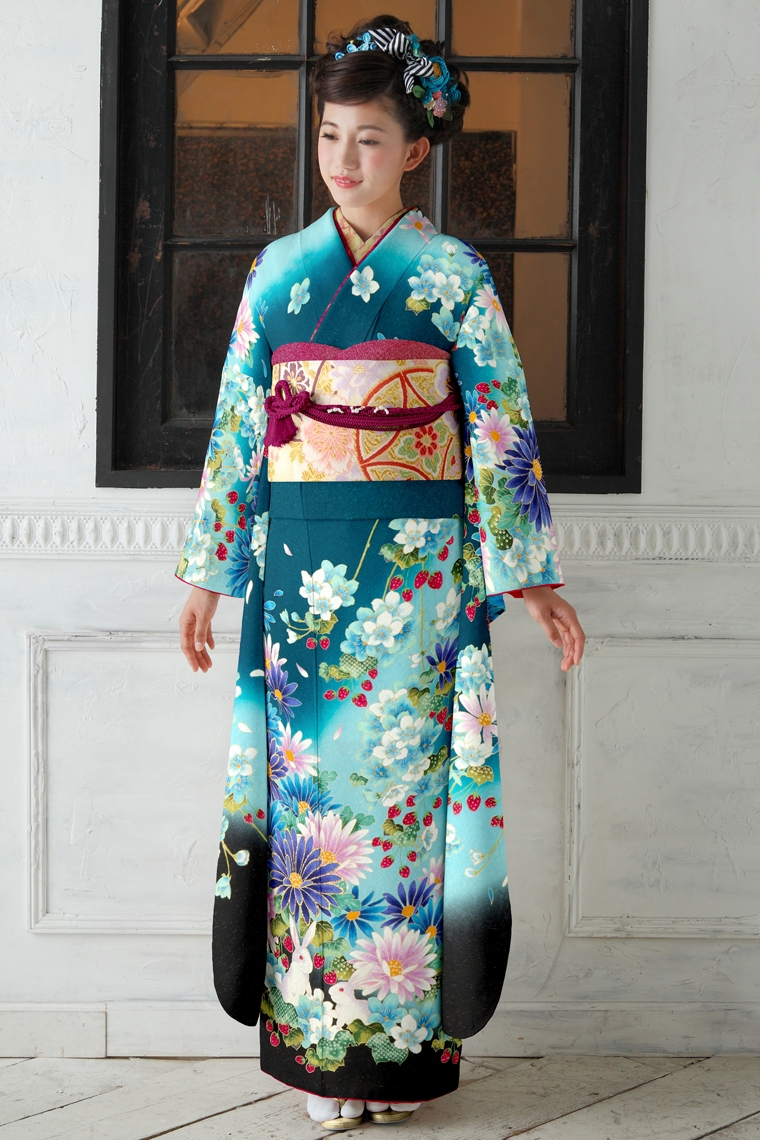 鮮やかなエメラルドグリーン色の地色に明るい光線で輝くようにぼかし染めされた美しい振袖。柄には、まるでおとぎ話の国の様なファンタジーな模様。裾や袖に描かれているウサギがとてもかわいらしいです。
