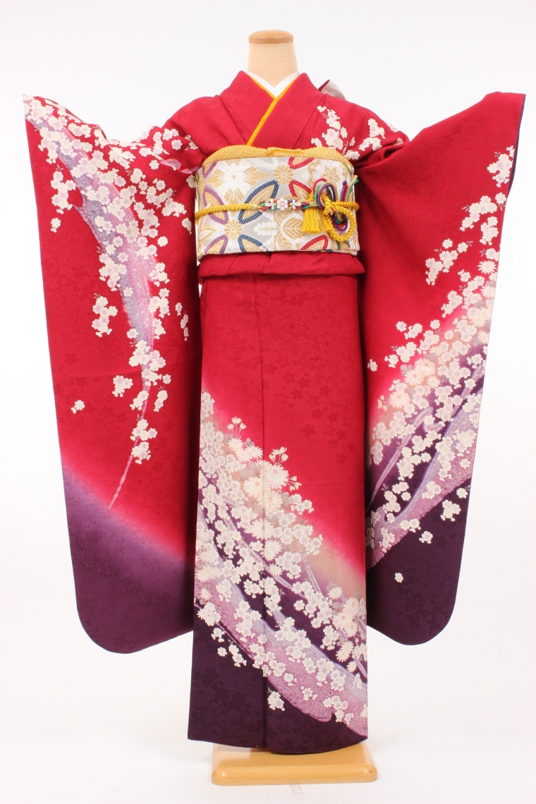 振袖レンタル Lサイズ 赤地裾紫ボカシ/花模様