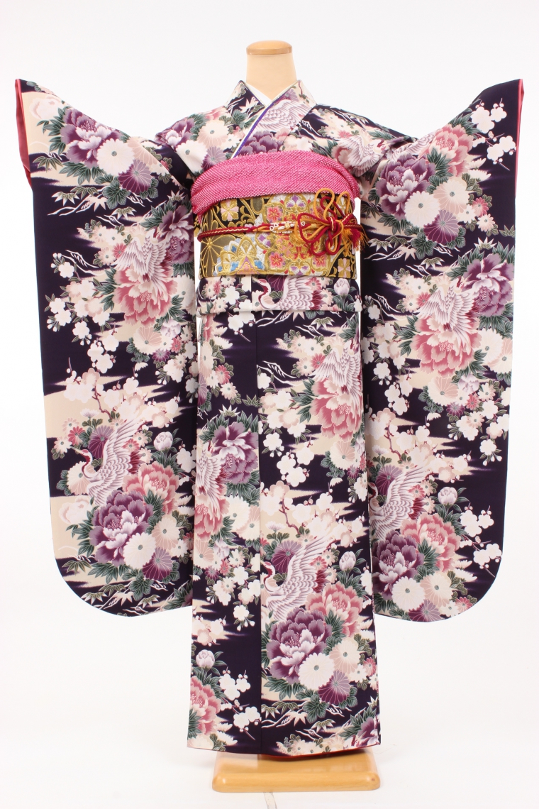 振袖レンタル Mサイズ 濃い紫/花模様に鶴