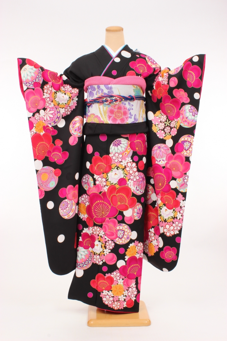 黒の地色に赤やピンクの大きな梅がかわいらしくたくさん描かれた振袖。ふわふわ宙に浮かんだような鞠が楽しそうに描かれています。