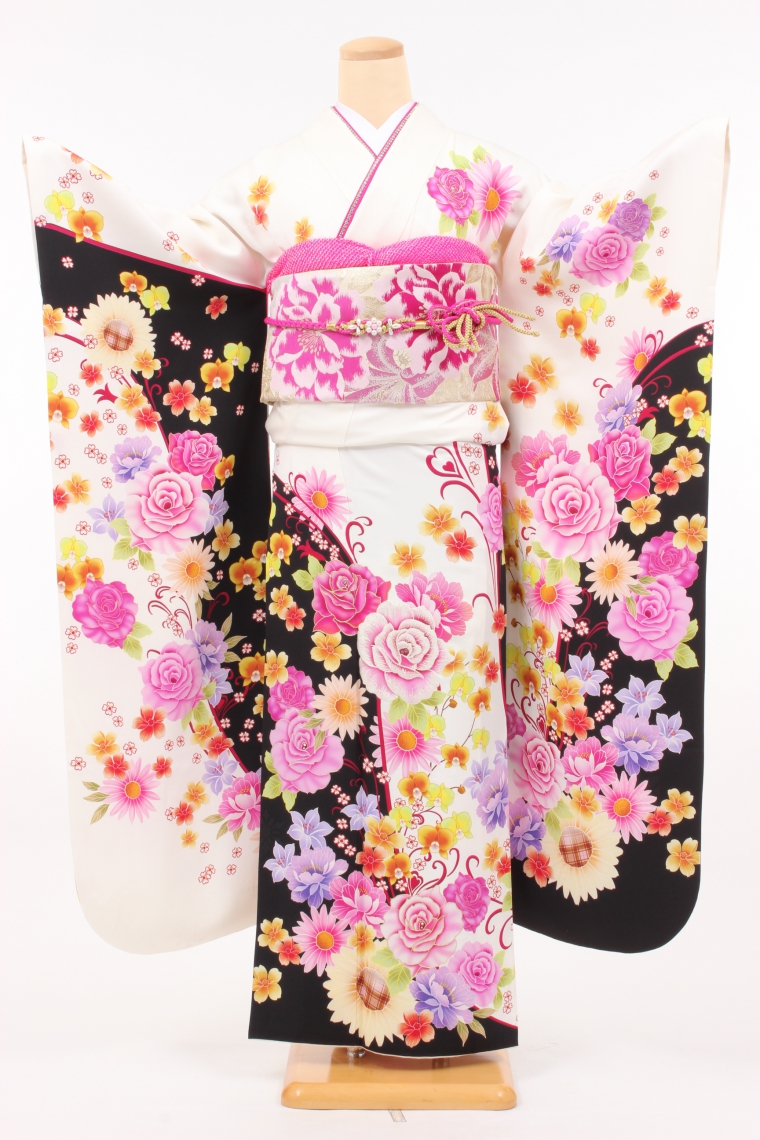 白地をベースに黒地に染め分けされた可愛らしい振袖。たくさんの花々がにぎやかに描かれています。