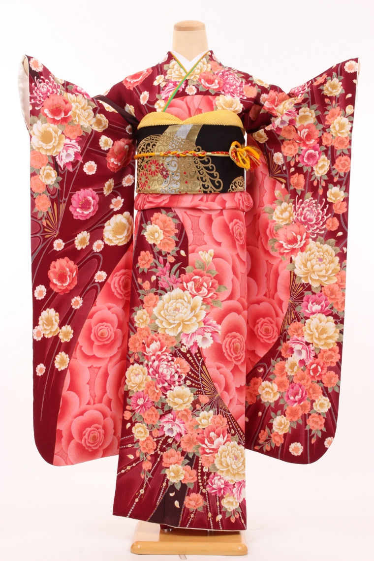 エンジとサーモンピンクに染め分けされた豪華な振袖。蝶の羽根とバラの花がいっぱいに描かれて、とても華やかな印象の一枚です。