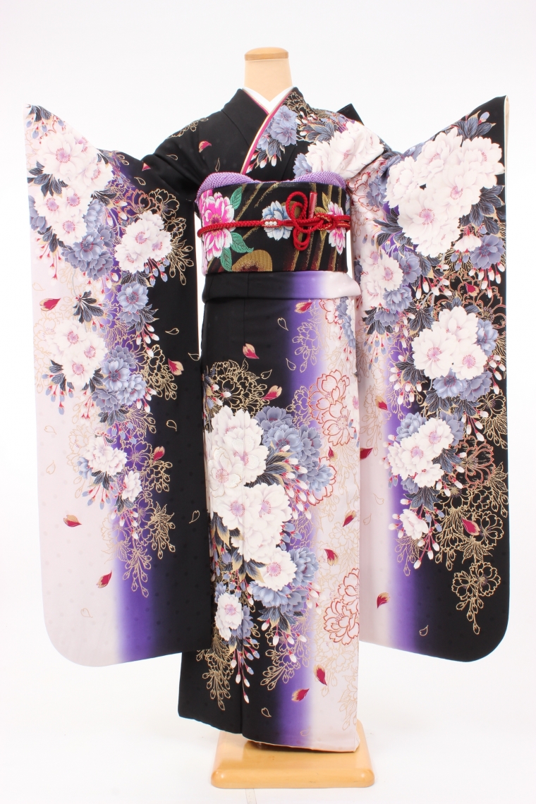 黒から白へと横へぼかし染めになった振袖。金で描かれた花と、友禅で描かれた花の共演が立体感を出しています。