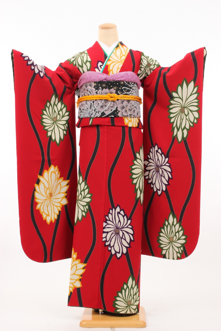 振袖レンタル Mサイズ 赤/立枠に菊菱/岡重