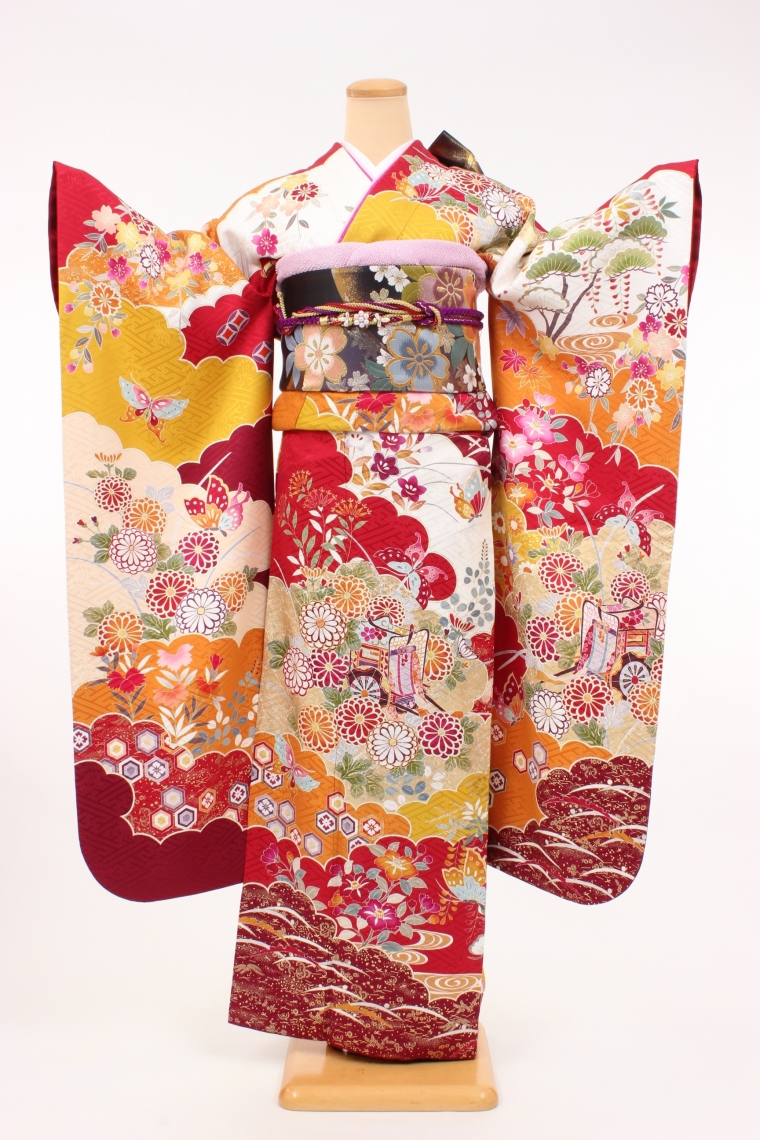 エンジや黄色などさまざまな地色で染め分けされた振袖に、煌びやかな金箔加工がされた豪華な一枚。鮮やかに描かれた唐車が華やかに演出しています。