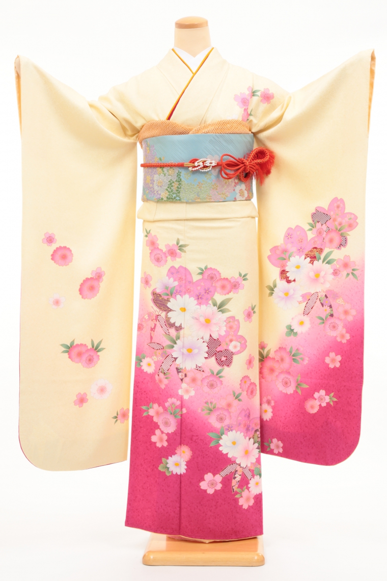 クリーム色からピンクに染め分けされた地色に、ピンクや赤のかわいらしい桜などの花々がところせましと描かれています。