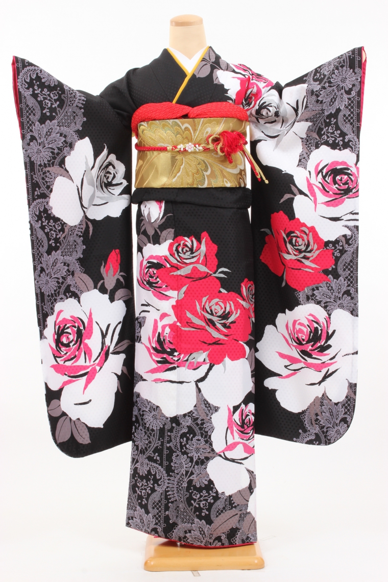 振袖レンタル Mサイズ 黒地/真紅の薔薇/Rumi K(キクチルミ)