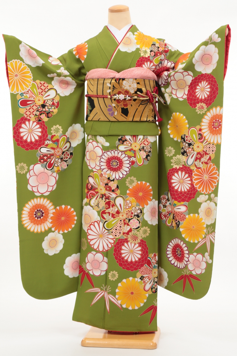 鮮やかな抹茶色が映える地色の振袖。柄にはまんまるにデザイン化された桜や菊がとても可愛らしく描かれています。