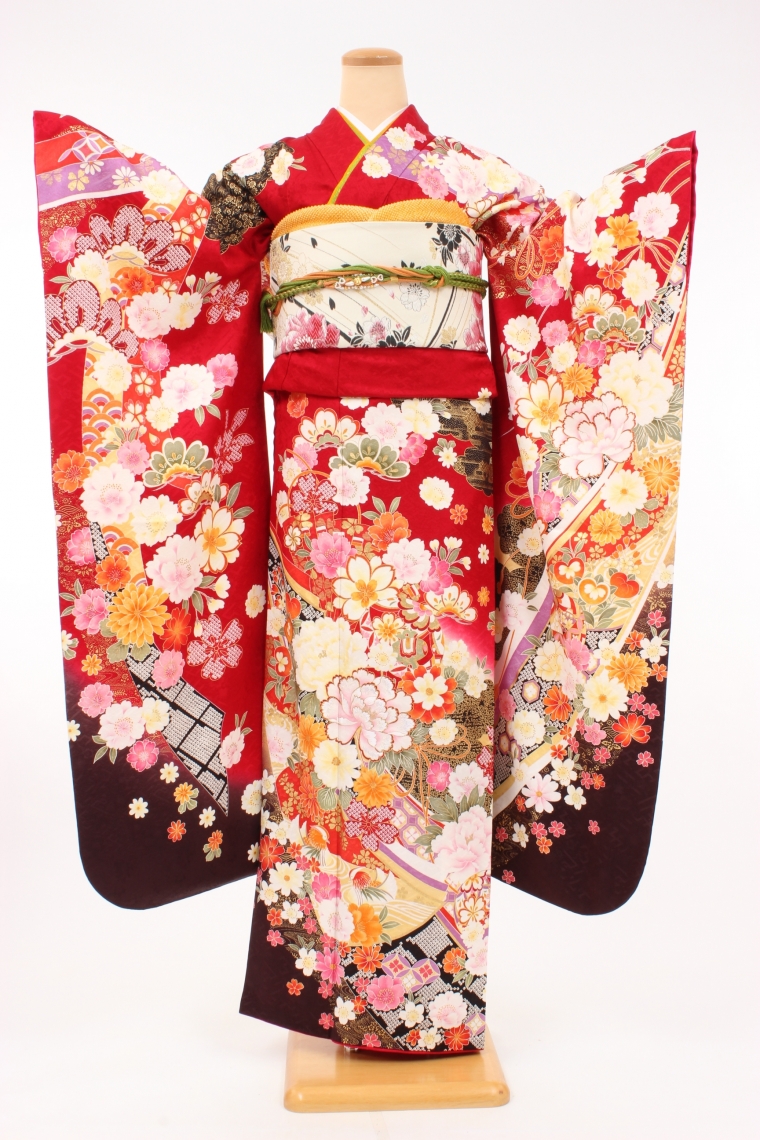 振袖は未婚女性の第一礼装です。成人式や結婚式、披露宴などの御呼ばれや結納などのお目出たい席にぴったりの着物です。和楽庵の振袖フルセットレンタルは、振袖、袋帯、長襦袢、帯〆、帯上、重ね衿、草履、和装バックの他に着用するために必要な和装下着、衿芯、帯枕、前板、後ろ板、腰紐、伊達締め、コーリンベルト、補正パット、補正用タオルが全てついております。また、足袋はプレゼントとなっております。その他にも髪飾りレンタルなどのオプション品もございます。