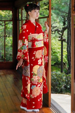 104-M-kaw0151 振袖レンタル Mサイズ 赤/桜丸文花びら散し 振袖 ~13号 お..