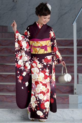 104-LL-kaw0087 振袖レンタル LLサイズ 濃紫/桜尽し 振袖 ~13号 お客様..