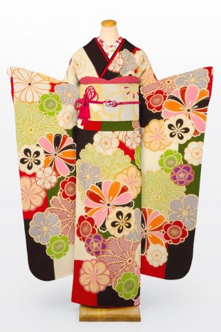 104-M-kaw0139 振袖レンタル Mサイズ 黒赤緑モザイク/菊と桜 振袖 ~13号 ..