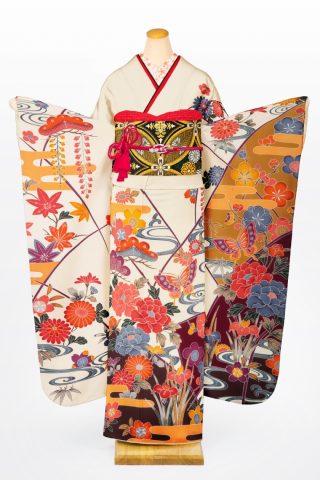 104-M-gaw9003 振袖レンタル 振袖Mサイズ ブランド:H・Lアシュエル 貝桶四季花鹿..