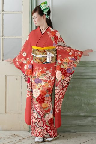 104-L-kaw0286 振袖レンタル Lサイズ 朱色/絞り染め百花繚乱 振袖 〜13号 ..
