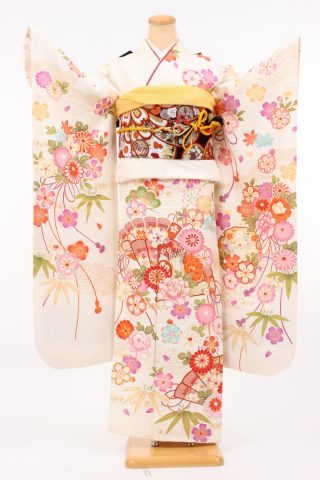 104-L-kaw0132 振袖レンタル Lサイズ 白/桧扇に花尽し 振袖 ~13号 お客様..