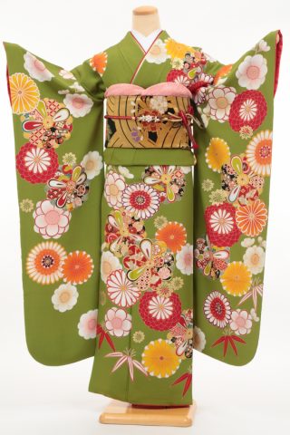 104-L-kaw0262 振袖レンタル Lサイズ 抹茶色/まんまる菊桜 振袖 〜13号 お..