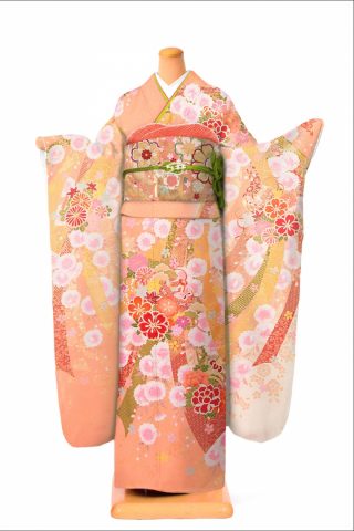 104-L-kaw0338 振袖レンタル Lサイズ サーモンピンク/熨斗目草花文様 振袖 ~13..