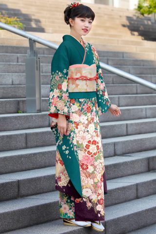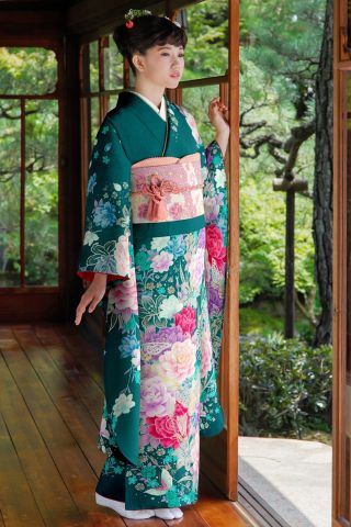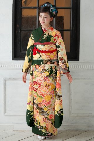 104-M-kaw0166 振袖レンタル Mサイズ 緑/雲取草花紋様 振袖 ~13号 お客様..