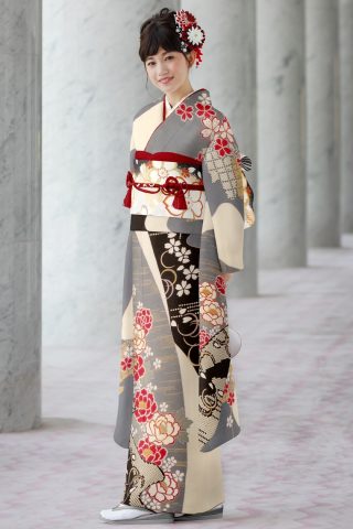 104-L-kaw0300 振袖レンタル Lサイズ 白地にグレー/おぼろ染め牡丹に桜 振袖 ~1..