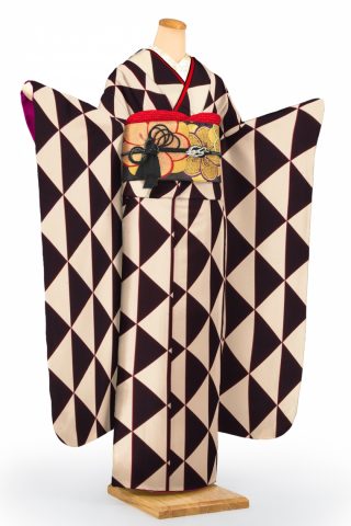 104-M-gaw0124 振袖レンタル Mサイズ 白黒/市松鱗文様2/きもの道楽 振袖 ~13..