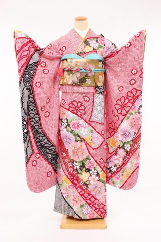 104-M-kaw0097 振袖レンタル Mサイズ 赤/絞り染 熨斗目草花文 振袖 〜13号 ..