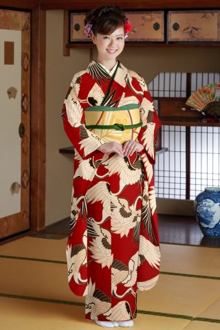104-L-kaw0116 振袖レンタル Lサイズ 赤/鶴の舞/きもの道楽 振袖 ~13号 ..