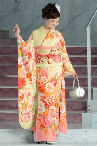 104-S-kaw0047 振袖レンタル Sサイズ 若草色/熨斗目に桜 振袖 ~13号 お客..
