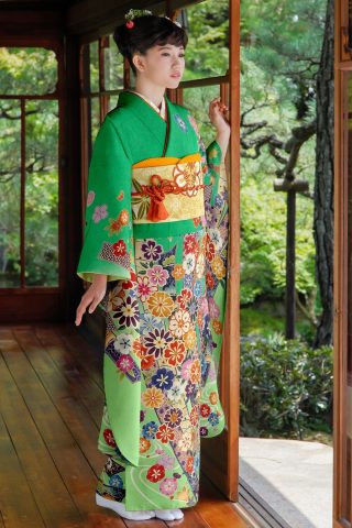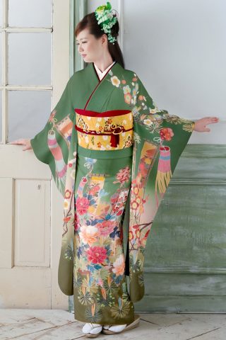 104-L-kaw0085 振袖レンタル Lサイズ 緑/幟旗に牡丹/田村哲彦作 振袖 ~13号 ..