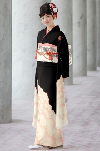 104-L-kaw0122 振袖レンタル Lサイズ 黒地/松/ツモリチサト 振袖 ~13号 ..
