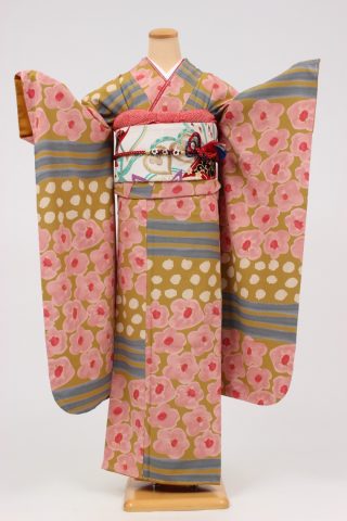 104-M-gaw0144 振袖レンタル Mサイズ 抹茶地/横段椿/ツモリチサト 振袖 ~13号..