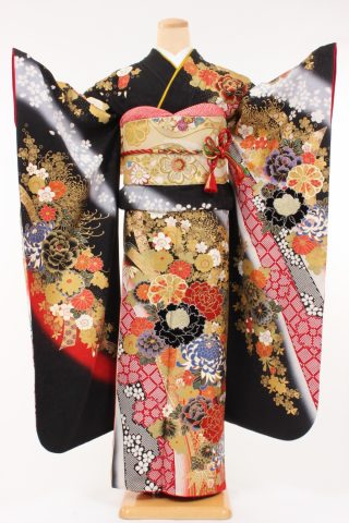 104-M-kaw0004 振袖レンタル Mサイズ 黒赤/牡丹 振袖 ~13号 お客様:S...