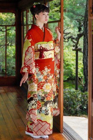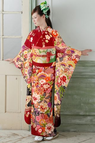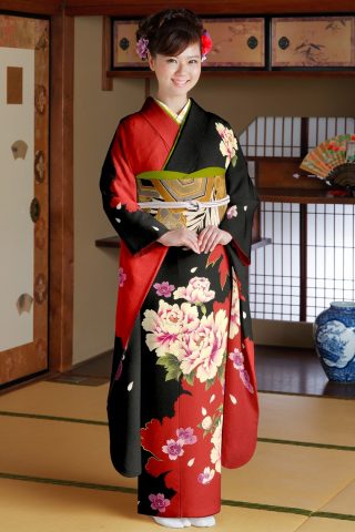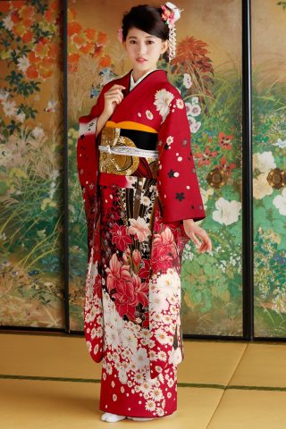 鮮やかな朱赤の地色に、雲取り模様で黒地に染め分 けされた振袖。柄には大きな牡丹が描かれた豪華な 着物..