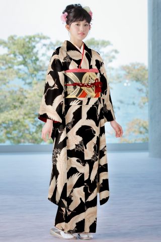 大きな鶴が群れで舞う様子が描かれたお目出たい柄 行きの振袖。黒地に白で表現されたデザインは古典 柄で..