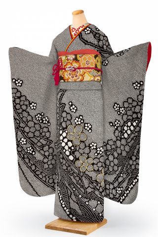 104-L-kaw0033 振袖レンタル Lサイズ 黒地絞り染め/束ね熨斗に桜 振袖 ~13号 ..