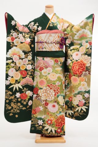 104-LL-kaw0064#1 振袖レンタル LLサイズ 深緑/豪華草花模様 振袖 〜13号 ..