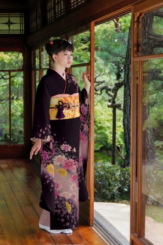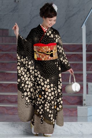 真っ黒の地色の着物に伝統技法の絞り染めで 柄を出しています。絞りで描かれた桜の柄は、 まるで雪が降っ..