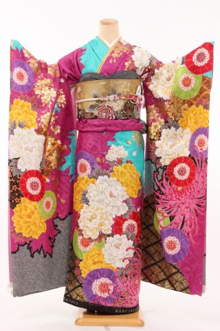 女性向けのファッションブランド「MARCURY DUO」の大胆なデザインの振袖。紫色の地色に 牡丹や..