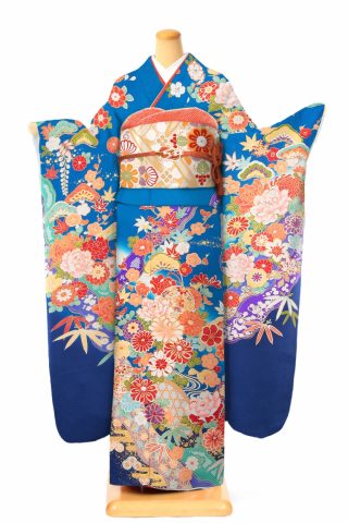 104-L-kaw0336#1 振袖レンタル Lサイズ 青/吉祥草花紋 振袖 ~13号 お客..