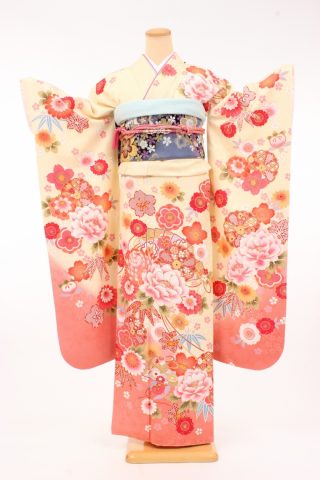104-S-kaw0048#1 振袖レンタル Sサイズ クリーム/檜扇に牡丹 振袖 ~13号 ..