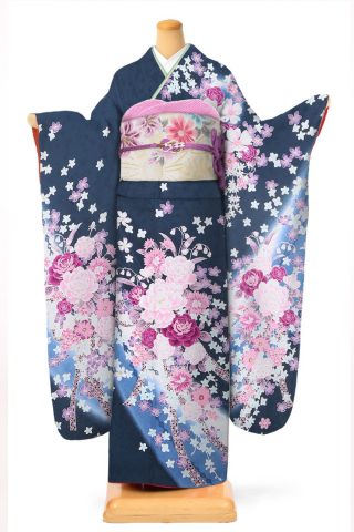 104-M-gaw0118#1 振袖レンタル Mサイズ 紺地/薔薇にリボン/H・L(アッシュエル..