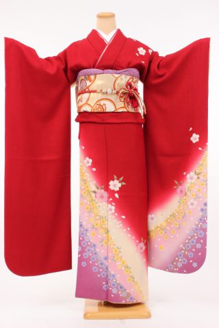 104-L-kaw0190 振袖レンタル Lサイズ 赤/四色ボカシ花模様 振袖 ~13号 お..