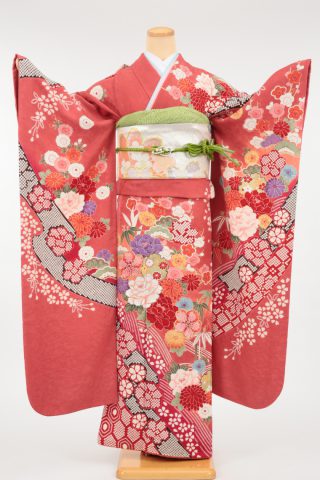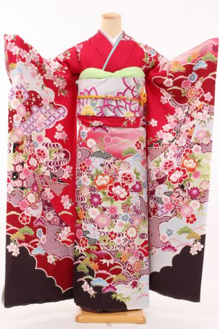 104-M-kaw0129 振袖レンタル Mサイズ 赤/絞り染雲取吉華文 振袖 お客様:S...