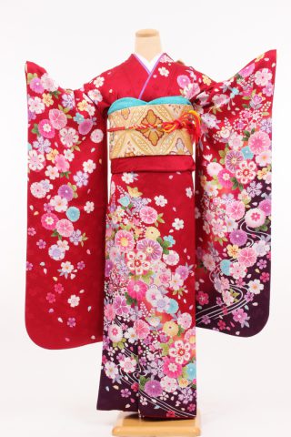 104-M-kaw0016 振袖レンタル Mサイズ 赤/流水にさくら 振袖 ~13号 お客様..