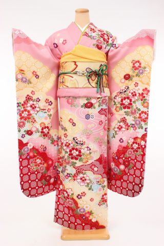 104-M-kaw0029 振袖レンタル Mサイズ ピンク/絞り染風 雲取り疋田に牡丹 振袖 ~..