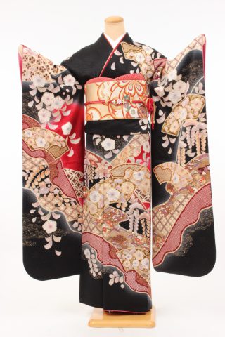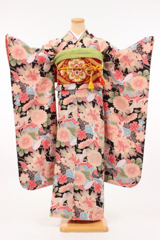 104-L-kaw0049 振袖レンタル Lサイズ 黒/扇面に花模様 振袖 ~13号 お客様..