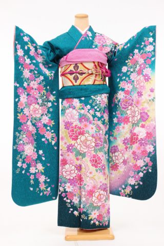 104-LL-kaw0008 振袖レンタル LLサイズ グリーン/花吹雪き 振袖 ~13号 ..
