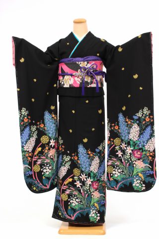 104-M-gaw0023 振袖レンタル Mサイズ 黒/宝尽くしに花模様 振袖 ~13号 お..