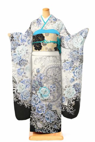 104-LL-kaw0101 振袖レンタル LLサイズ 白地/欧風唐花薔薇模様 振袖 ~13号 ..